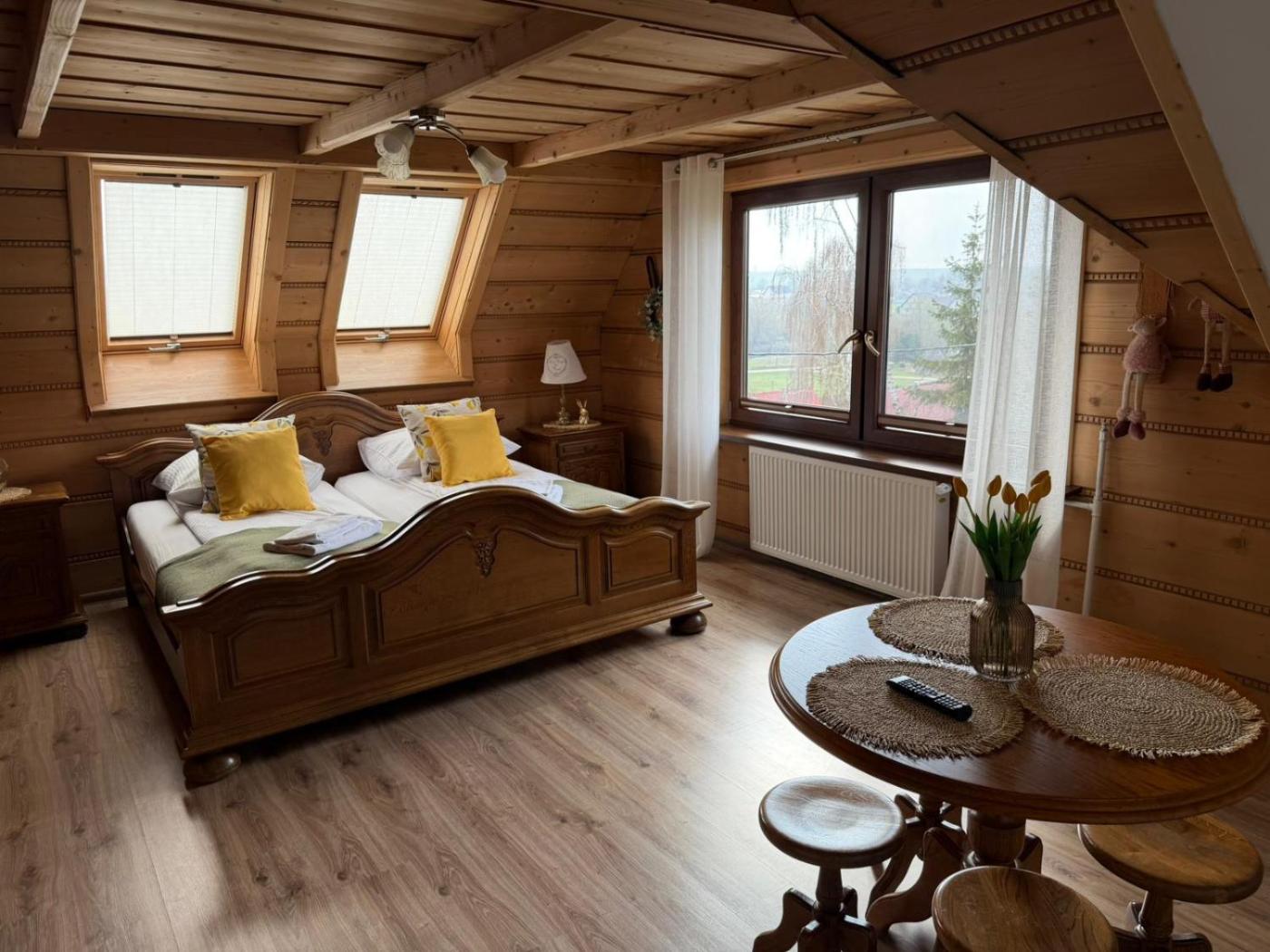 Mały pokój Dwuosobowy. The double room features a private bathroom equipped with a shower and a hairdryer. The fully equipped kitchenette has a refrigerator, kitchenware and a microwave. The double room offers a tea and coffee maker, a wardrobe, heating, a flat-screen TV with cable channels, as well as garden views. The unit offers 2 beds and 1 futon. Powierzchnia pokoju ok.: 20 mkw. ;